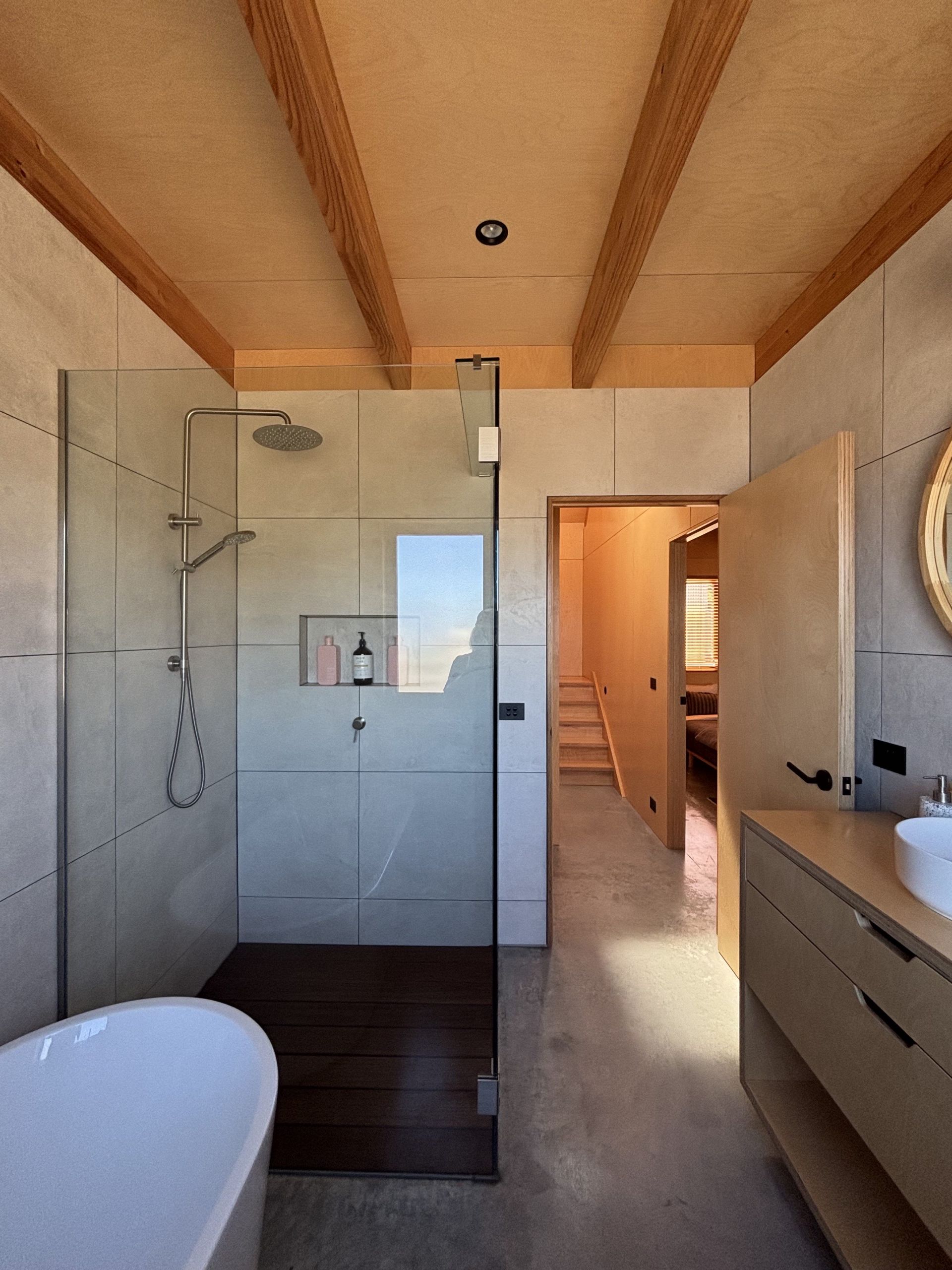 There are two bedrooms and two bathrooms including an ensuite. The master bedroom is on the mezzanine level with Velux windows that open to impressive Southern Ocean views, as well as allowing cool summer sea breezes to circulate. In winter the combination of double glazing, well insulated walls, and the concrete floor's thermal mass passively warms the house, all up creating a very stable temperature.