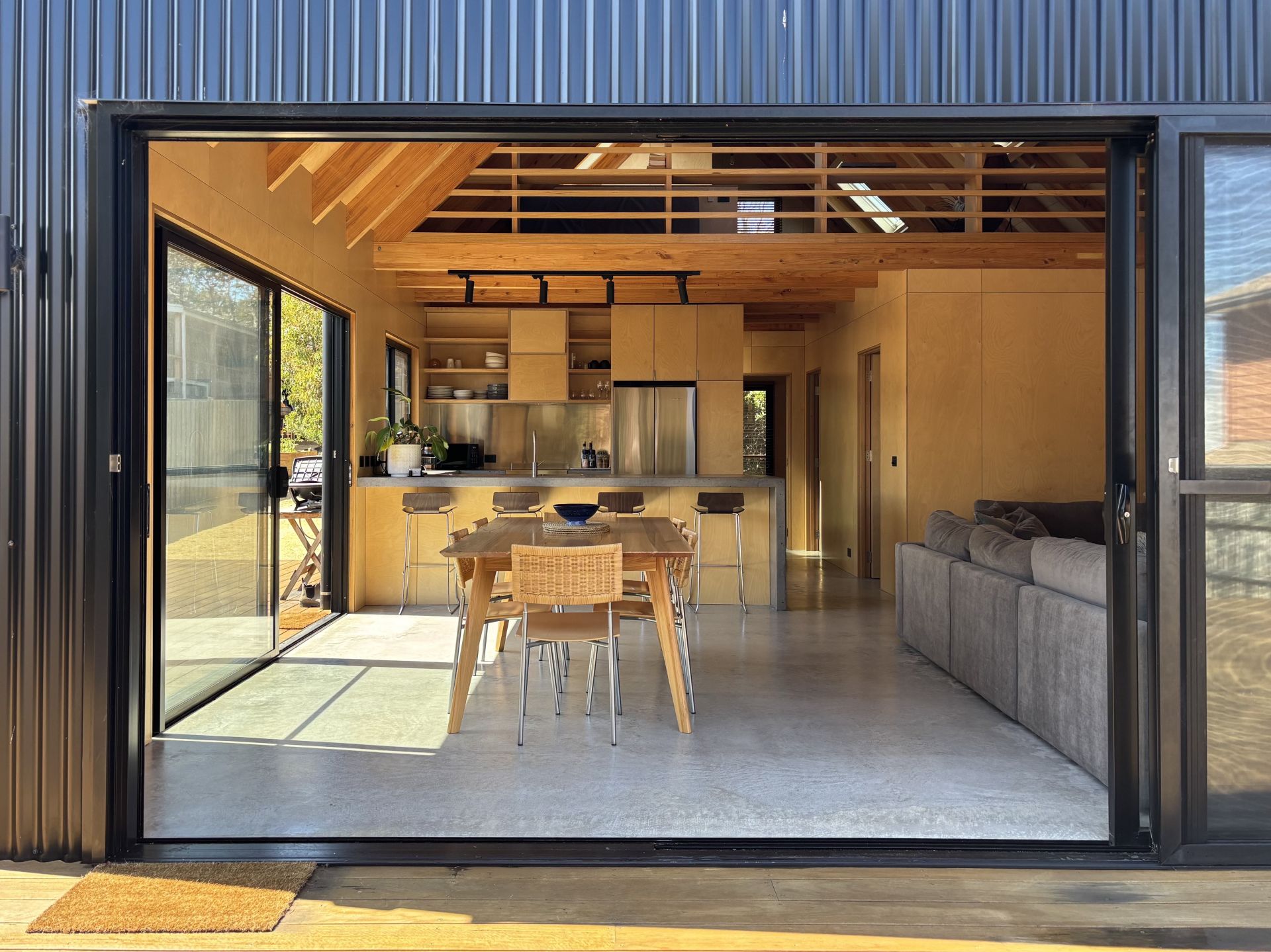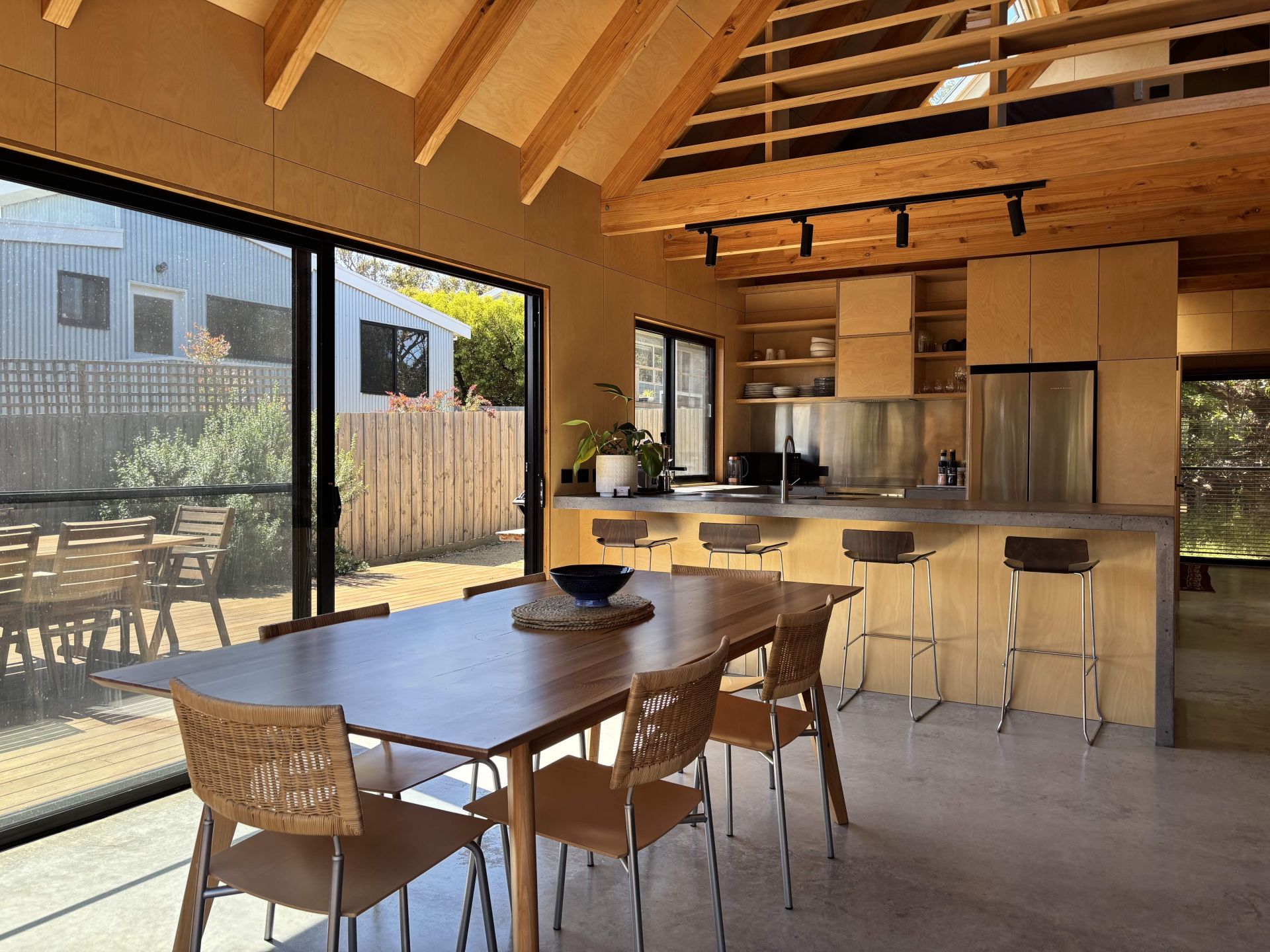 The entire house is lined with beautiful, yet functional, blonde birch plywood that provides the perfect canvas for inspired decoration. There are quality appliances, a concrete kitchen benchtop, burnished concrete floors. The house is also ideal as an investment property having proved very popular on Airbnb. The property also has the added potential for subdivision.